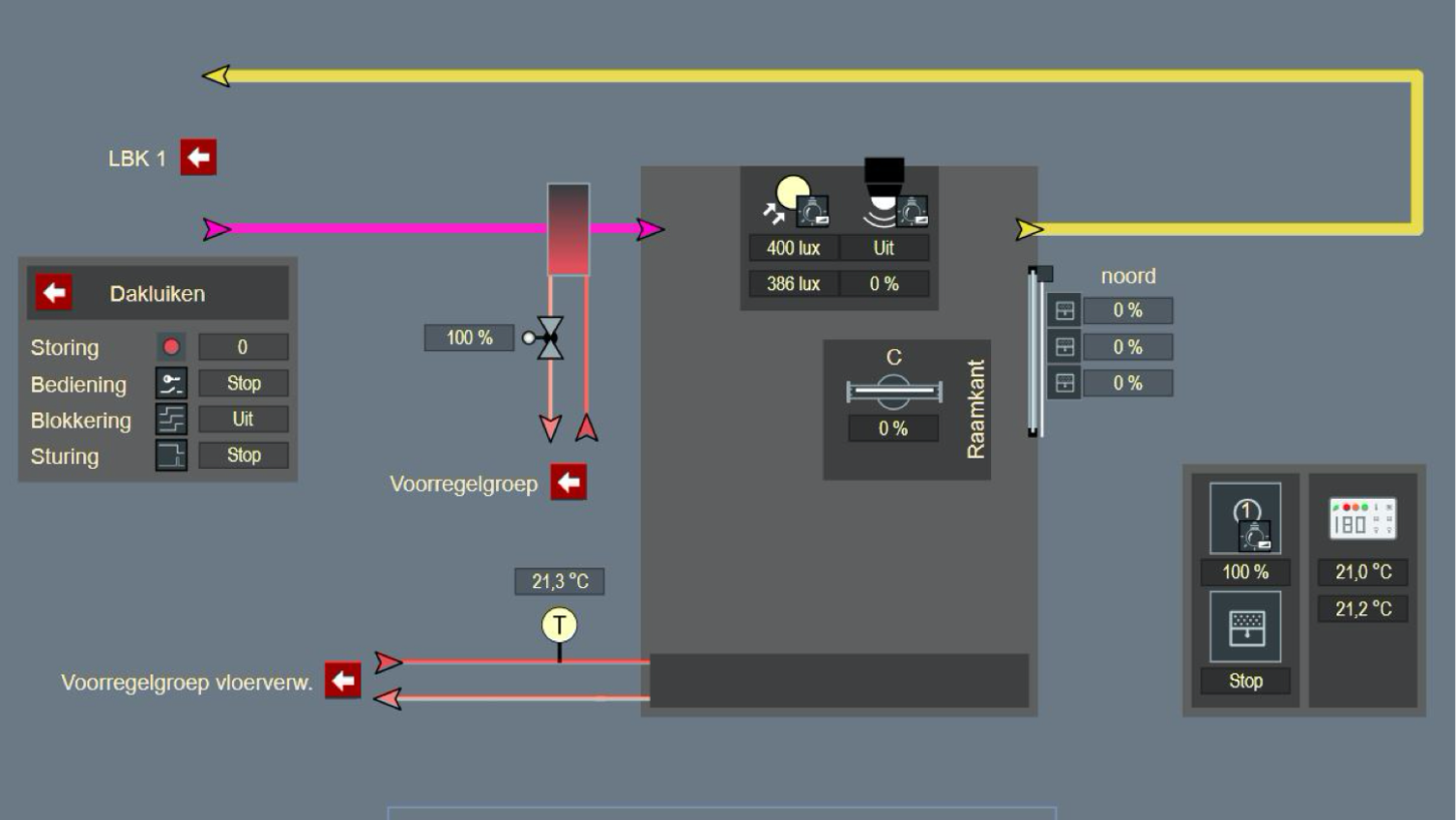 Zo komen bij dit project veel verschillende facetten van gebouwautomatisering bij elkaar in één gebouwbeheersysteem. Door middel van een touchscreen is het gehele systeem centraal bij de balie te bedienen. Wij regelen de gebouwinstallaties met Priva Blue ID en leverden eveneens de naregelingen. In de lokalen meten we licht, temperatuur, vochtigheid en signaleren we aanwezigheid via multi-sensoren, die zijn aangesloten op de Priva DALI Roombus. Daarmee wordt ook het verlichtingssysteem van de E-installatie bediend. Met Touchpoint One bedienunits voorzien van geïntegreerde CO2-meting zorgen we tevens voor frisse lucht in de lokalen. Naast temperatuur, CO2 en verlichting is ook de zonwering volledig geïntegreerd in het naregelconcept.